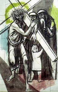 En regardant, on imagine que sur ce long parcours qui mène le crucifié au Golgotha que le chemin n’est pas semé de roses ! La foule en délire accompagne le « profanateur » à l’ordre établi. Elle se répand en invectives contre cet homme ramassé par le lourd fardeau qu’il porte sur une épaule. Il met genou à terre « ce chef d’un mouvement de libération recherché pour exercice illégal de la médecine (guérison), fabrication de vivres sans patente (multiplication de pains et aux noces de Cana change l’eau en vin), voie de faits sur les marchands du temple ». (ces vendeurs de souvenirs profanes) Regardez les visages des quelques familiers qui l’entoure. Leur regard traduit l’abattement, la peur, les scrupules de conscience. Ces murs d’images sont des cris de douleur mais l’artiste ne les perçoit pas. Il véhicule à sa manière la souffrance, celle d’une mère envers son fils qui agonise ; d’une pécheresse repentie ; celle d’un homme qui fait l’effort à soulager les douleurs. Ces dessins sont une force mystique et de paix. Charles Eyck a reçu cette année là, le don du ciel. Il nous invite à faire arrêt sur image devant ses fresques et ses peintures et nous faire partager ses émotions tactiles. Personne ou quiconque ne peut rester insensible à cette beauté de caractère.